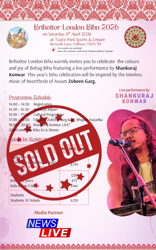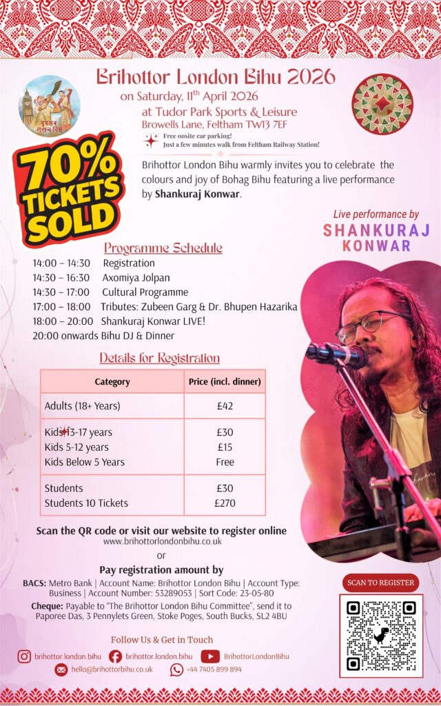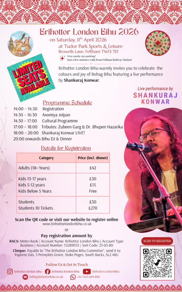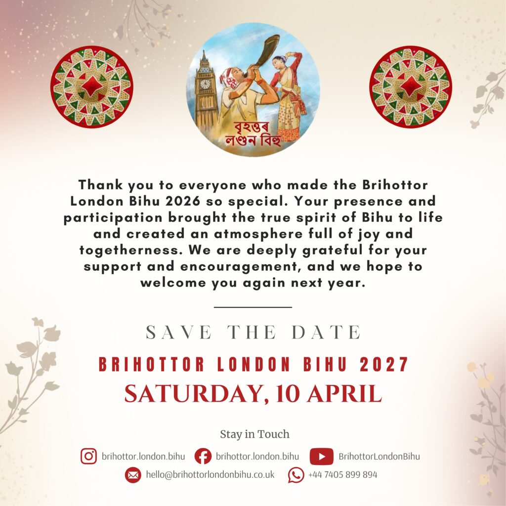 We are thrilled to invite you to yet another grand celebration of Brihottor London Bihu on Saturday, 11th April 2026, in Feltham. Seats are limited, so reserve yours now!